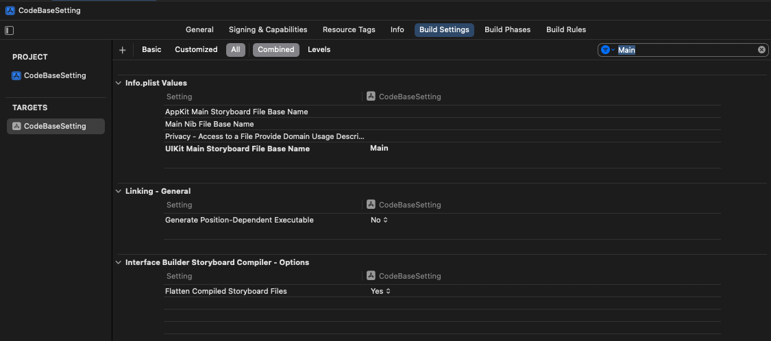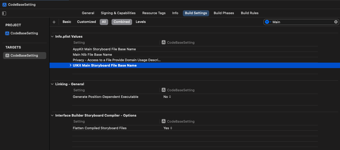 Build Settings에 있는 Main.storyboard에 대한 정보를 지워야 한다.